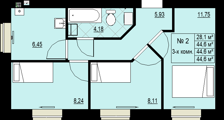 Трёхкомнатная квартира 44,6м2